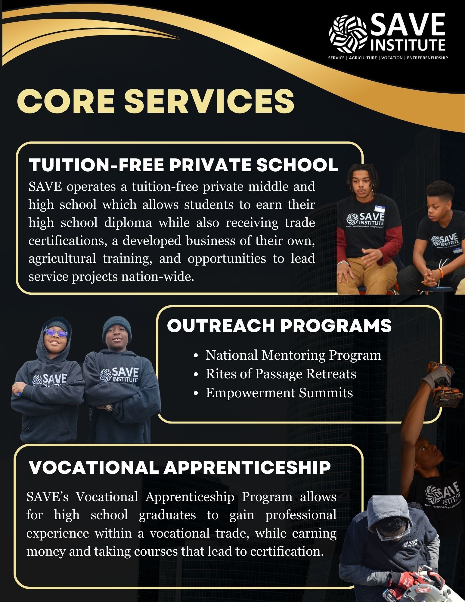 SAVE Institute's Middle and High School programs are an innovative alternative to traditional school that allows for students to learn academics through projects, life experiences, agriculture, vocational training and implementing business enterprises.