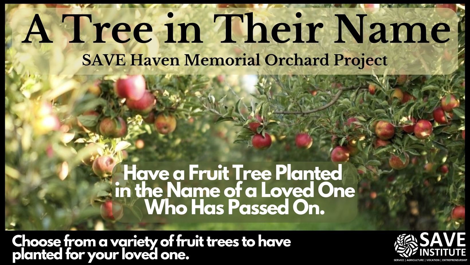 gives community members the opportunity to have a fruit tree planted in the name of a loved one who has passed on. You can choose from a wide variety of fruit trees that you would like to have planted. Each tree will be labeled with the name of the person who it is dedicated to. You will also have the opportunity to participate in the actual planting as well, if you would like. This Memorial Orchard is being installed on the new campus of SAVE Institute known as SAVE Haven.